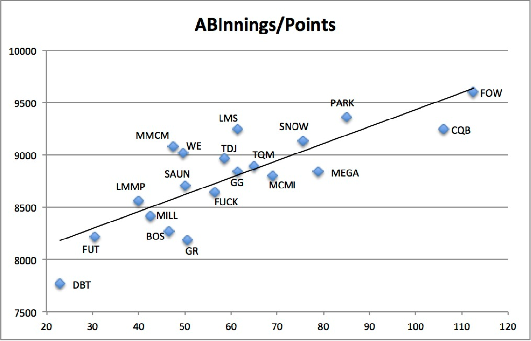 If you need some further evidence on the correlation between number of AB and IP to total points gained over the course of the season, I’ve put this chart together. Here, I combined the total AB and IP to create an ABInnings stat and plotted it against the final points standing in the table. As you can see, there’s a fairly strong link between the two. CQB is a bit of an outlier but that’s mostly because the total points available in SOP was higher and more ABInnings were recorded on average over Mayberry. Otherwise it makes for a fairly nice correlation.
